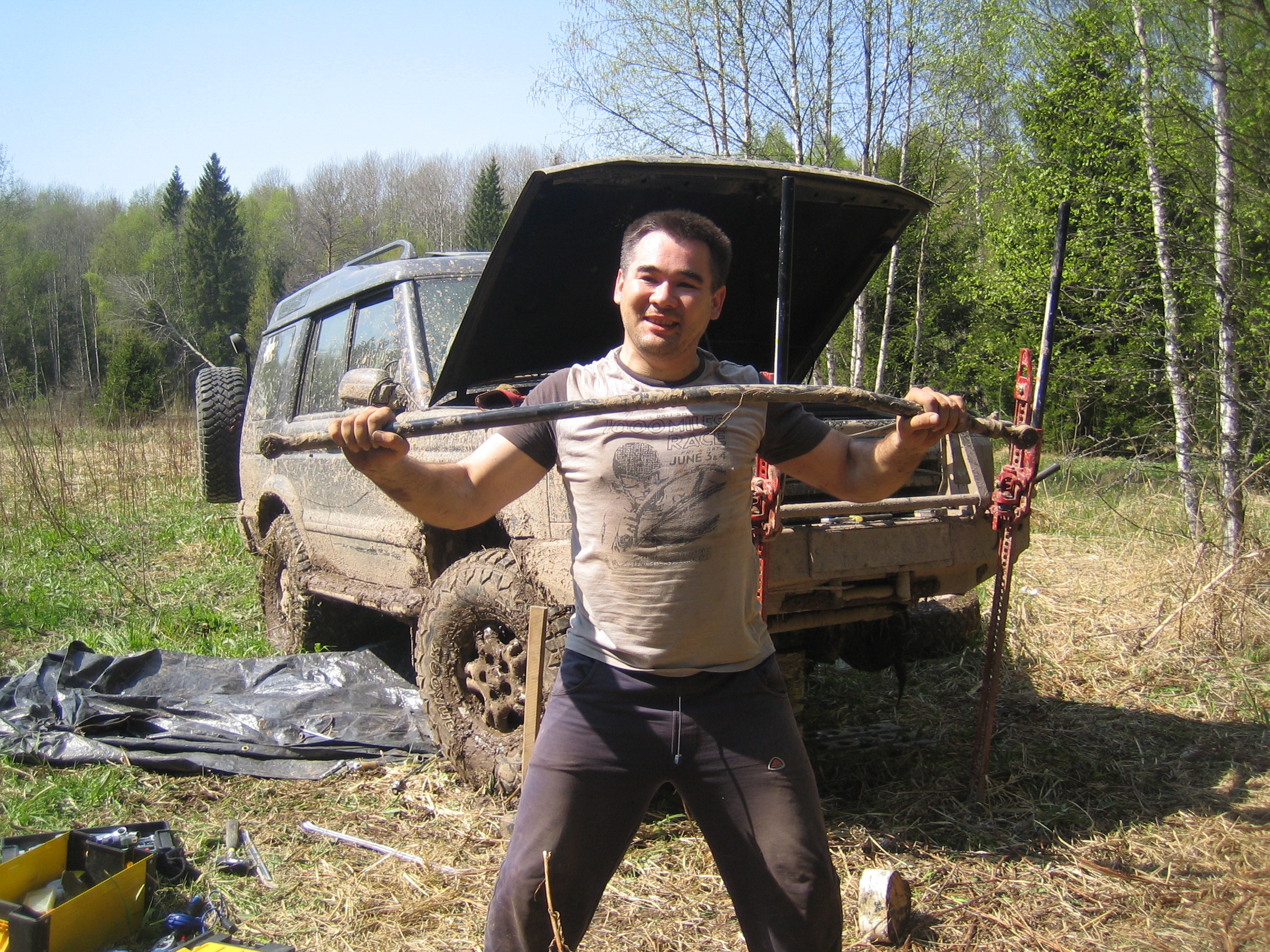 Как ни странно, с машиной ни чего серьезного не случилось. Потери не велики. Погнули порог хайджеком при спиливании пенька, попавшего между мостами, Разрядился аккумулятор, ответственный за кручение лебедок (дома зарядил). Надо реконструировать электрику, управляющую лебедками. Пневмоблокировки, отремонтированные в Lr.ru на прошлой неделе опять отказали - будем чинить.