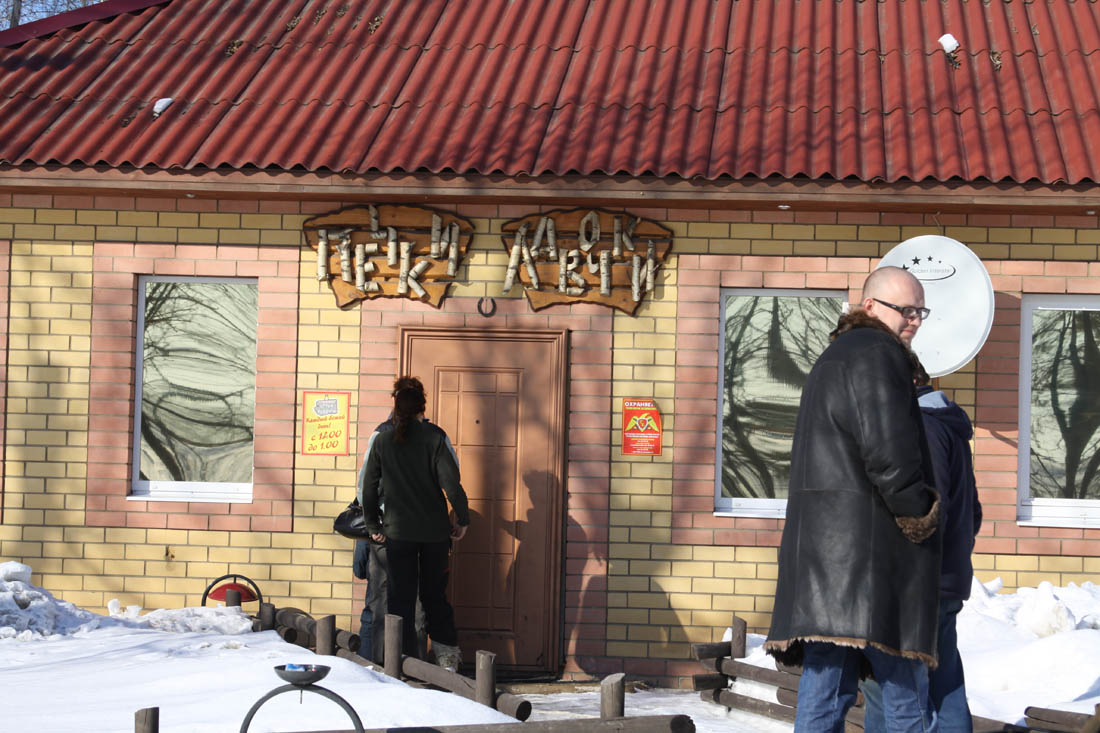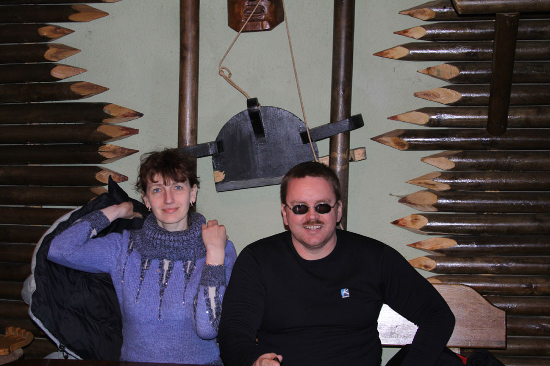Да ....с ним, с обедом. Вы лучше обратите внимание на антураж комнаты в кафе, где мы сидим. И где Примус типа вешаться собирается. Это ж пыточная...там даже на кольях, которыми стенка отделана краской вроде как кровь изображена, а за спиной Олега - гильотина. Две виселицы висели по бокам входной двери...даже была паяльная лампа)))), хотя это вроде ближе к 90-м годам орудие пыток))). За моей спиной висела - не знаю как называется, что-то типа "испанского воротника", это когда голову каторжника и руки заделывали в такой деревянный "воротник"..... Кто и какой головой думкал, когда такой интерьер создавал в придорожной кафе - остается только догадываться. Жаль только не придумали, как за 1,5 часа картошку научится жарить (именно этого супер блюда мы так и не дождались с Вадимом) :)
