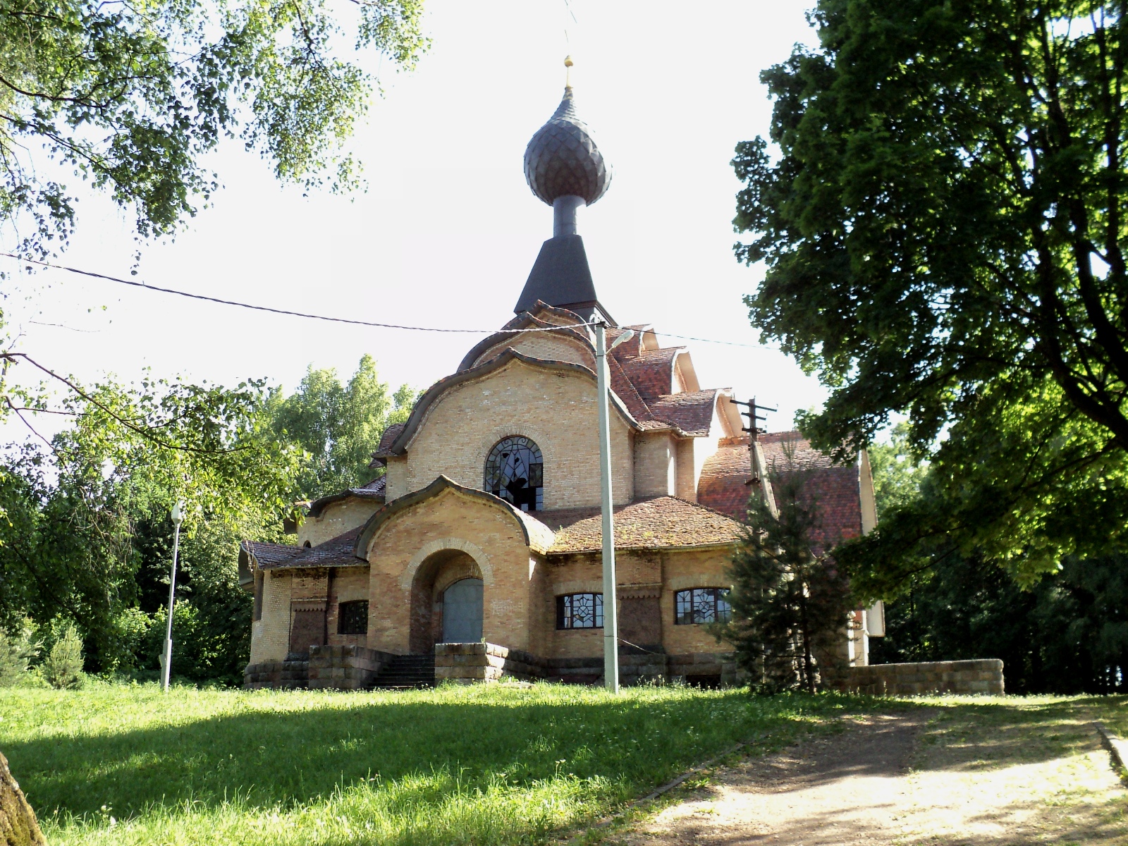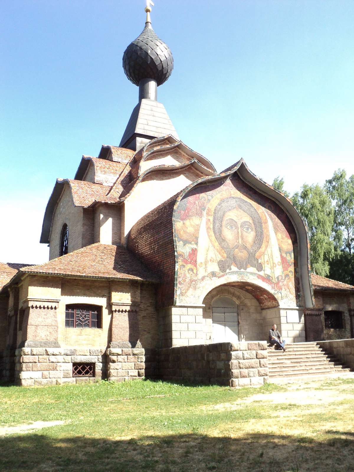 Архитектура этого храма нам показалась необычной...от расположения окон, до черепицы...Казалось, что черепица из карамели...так она частями светилась на солнце. Впечатлил и портрет Иисуса своими масштабами и расположением на храме. Хотелось бы, конечно, взглянуть на остатки убранства, но церковь закрыта...просто закрыта...даже не на реставрацию...Окна побиты, в подвале мусор...Возможно, когда-нибудь фонд имени Тенишевой М.К. всё-таки отремонтирует этот храм и приведёт в первоначальный вид...
