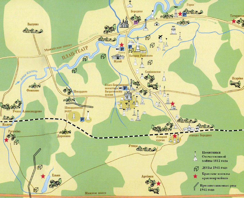 Впечатления, несмотря на пасмурную погоду, остались очень и очень положительные. Понравилось все: и сам бой, и пиротехника, и скрупулезно восстановленная форма участников, и люди, все это организующие и этим живущие. Чем-то они напомнили мне нас :). Места, надо сказать, сказочные: великолепная природа, ухоженные поселки, хорошие дороги; чистая, убранная территория. Решил, что летом надо ехать семьей с ночевкой на берегу речушки и не спеша посетить музеи, памятные места, послушать экскурсоводов. А посмотреть есть на что, помимо Бородинских достопримечательностей есть Кубинский музей танков (один их крупнейших в мире) и сам Можайск. Вот карта достопримечательностей у Бородино: