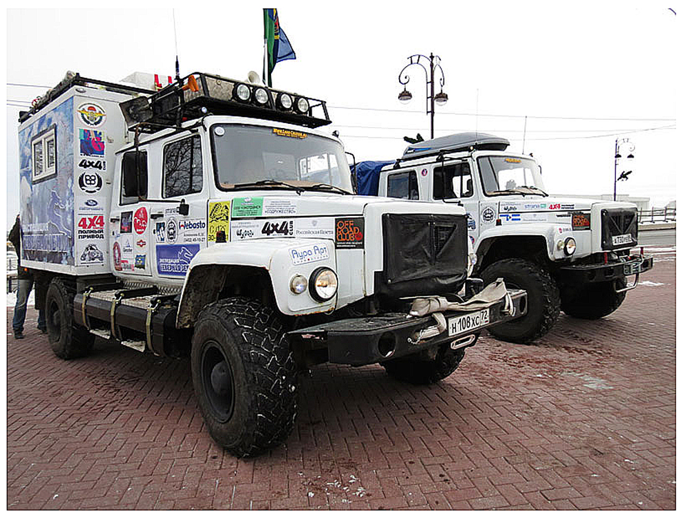 «Единственное, поставили автономный подогреватель на двигатель и в будку основного автомобиля, утеплили салон — поставили двойные стекла, увеличенные до 1000 литров топливные баки, вот и все доработки, — сообщил Александр. — «Техничка» у нас без подогрева, пришлось экономить, так как больших спонсоров у нас нет".