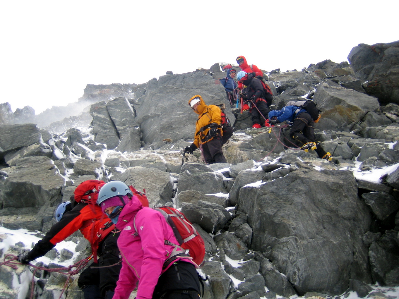 Дубак реальный, но деваться некуда. Переночевали. Люди начинают кашлять. За дверью ужас. Пойти в туалет без кошек невозможно - уносит ветром. Мы отследили небольшое улучшение видимости (не ветра :lol: ) и решили попробовать проскочить вниз. Прошли метров пятьсот и видимость пропала, мы опять сбились с маршрута. Попали на ледник, с трещинами. Как раз такое замечаетльное место, где от горы откалываются льдины и снег и летят километрик вниз :lol: Лезем. У трещин дна не видно, никто не знает, насколько это все крепко держится. Очень опасно. Решаем лезть вверх. Склон с крутизной градусов 45 из твердого снега плавно превратился в ледяной с крутизной градусов 60. Крутим ледобуры, делаем страховку. Выбрались на более-менее пологое место. Замечаем двух наших гидов, которые вышли снизу на помощь. Идем к ним. Парочка лавиноопасных склонов и - встреча! Горячий чай, все молодцы, спасибо.
