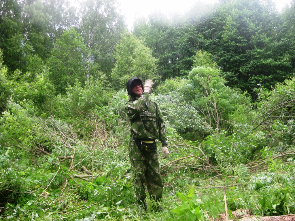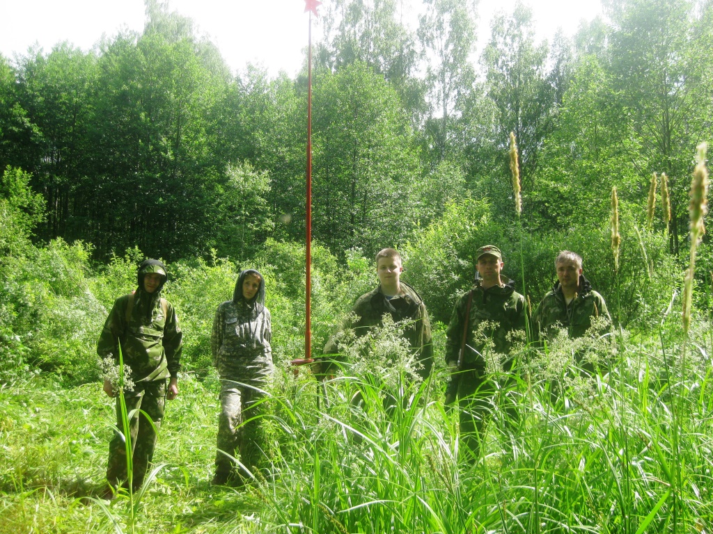 Выехали к месту одним экипажем: Ok-Escudo, Elka и я на моем автобусе. Прибыли к обеду. Слепни долбят по стеклам, даже выходить страшновато. Переоделись. Автобус оставили на входе в лес. Лена взяла рюкзак с водой, аптечкой, триммером и инструментами. Олег настроил навигаторы на точку. Я зарядил ружье и пошли. Шли в этот раз до Подмошка по дороге, а далее сразу забрали в лес тем путем, которым в прошлый раз выходили. Пошли по азимуту, без дороги. Забегая вперед скажу, что этим же путем ходили в последствии поисковики, поднимавшие останки воинов для перезахоронения. Шли около двух часов. Место нашли сразу. Знак наш стоит, все в порядке. Оставили принесенное, вернулись к автобусу, поехали к месту лагеря. При переезде через канаву я сел, вещи к лагерю носили на руках, затабарились.