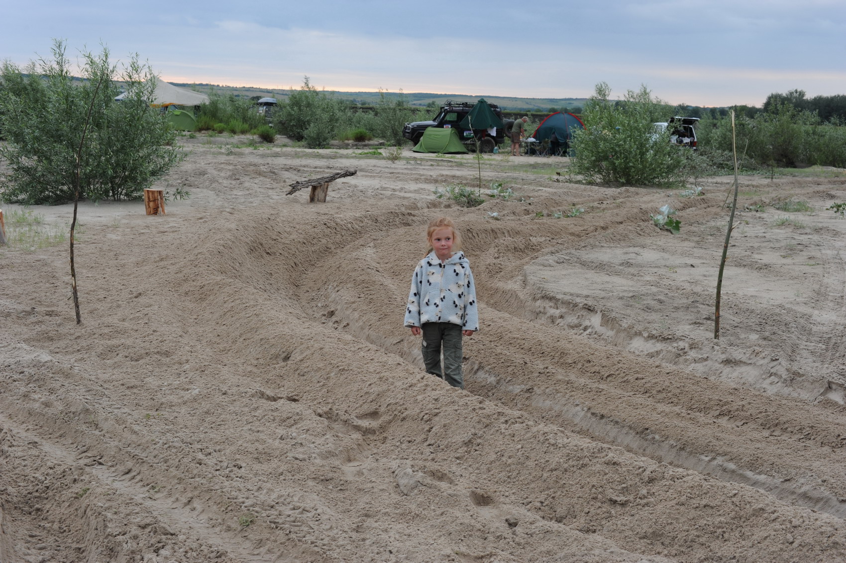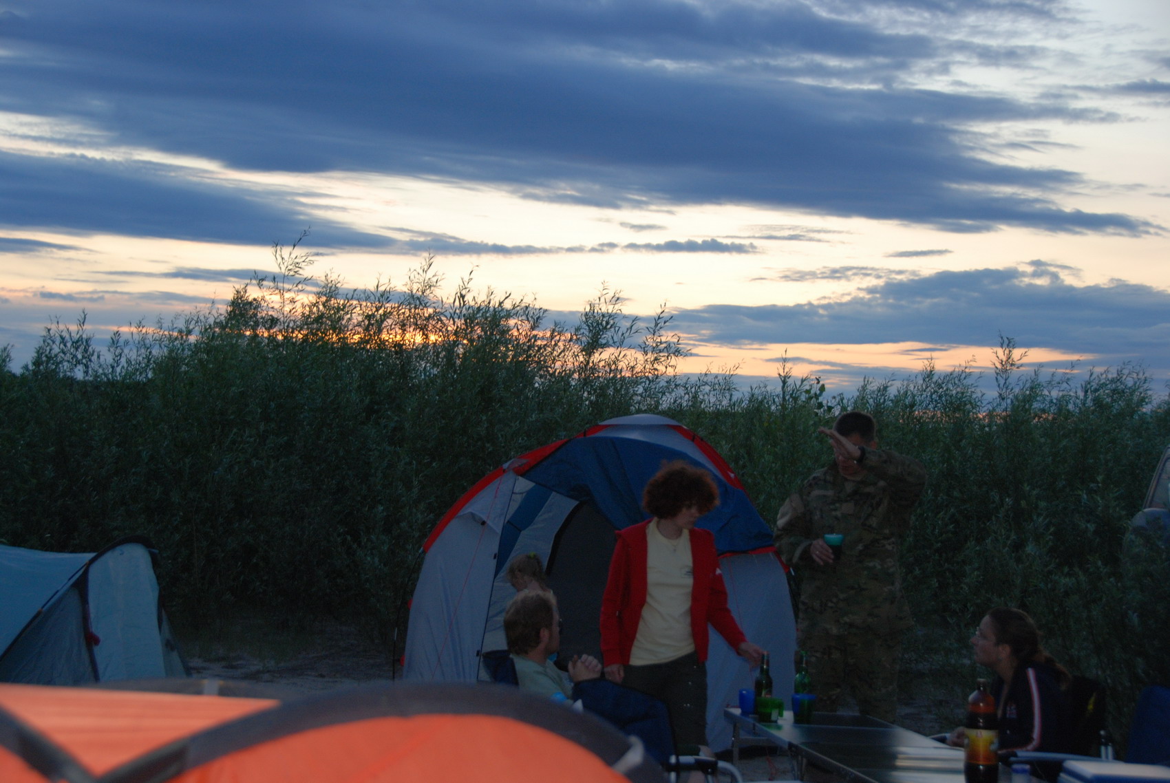 На место ночевки прибыли засветло. Тут пришлось помучиться с выбором места – выбор был. В процессе поиска выдернула Патриота, застрявшего в песках…Ведь Патриот Патриоту друг.