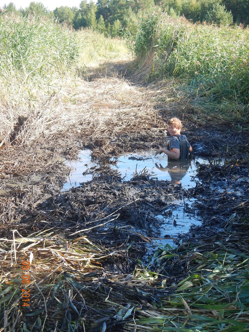 2. Шли так: тростник около 4-х км, ходом, вытягивая удлинитель в двух местах до леса - около 200 метров. Когда поняли, что за 1 день не пройдем, решили возвращаться, но до выхода не дошли около 1 км, положили в промоине машину набок. Залебедиться не смогли, после покладки это вообще стало бессмысленно.