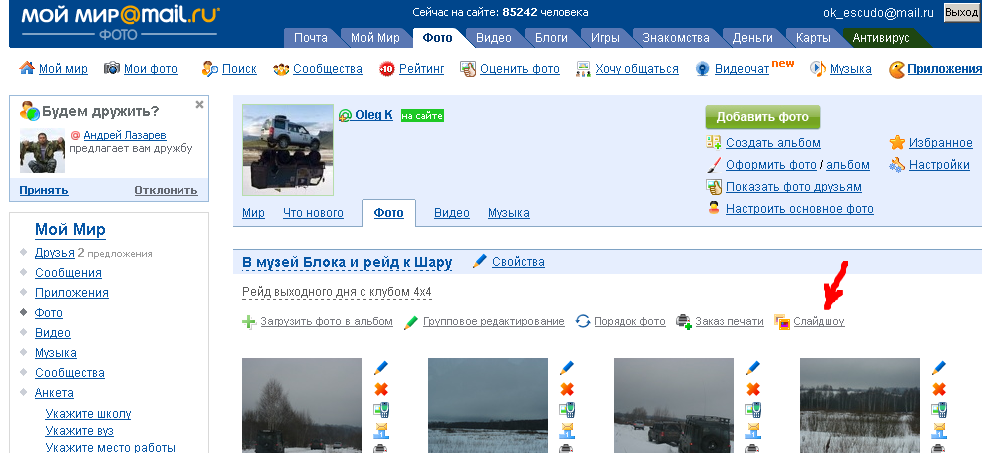 дальше создаем альбом, закачиваем фотографии - всё, как обычно. В режиме просмотра альбома выбираем ссылку "Слайдшоу"