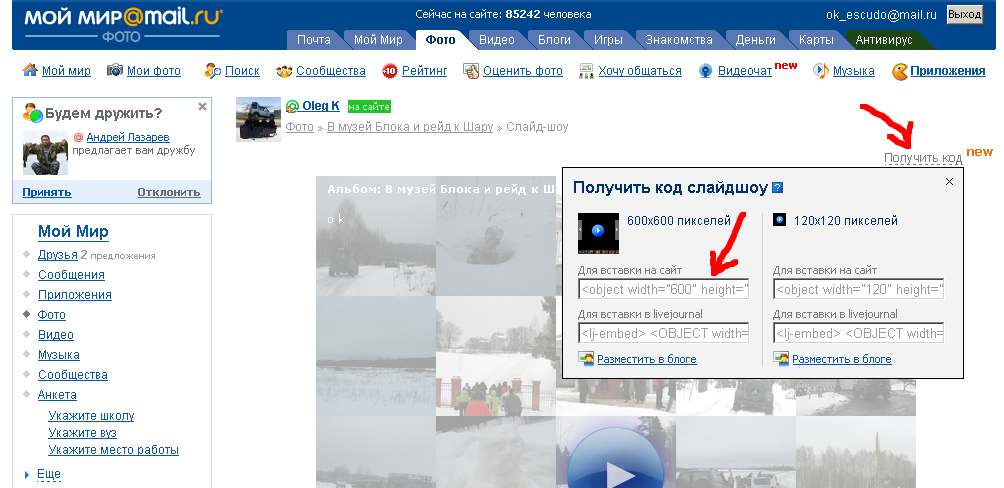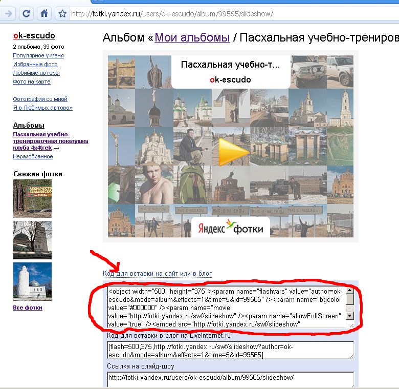 В появившемся окне выбираем закладку "Слайдшоу 2" и копируем в буфер обмена код альбома.