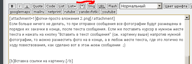 Если больше ничего не делать, то при отправке сообщения все фотографии будут размещены в порядке их закачки в конце, после текста сообщения. Если же поставить курсор в нужном месте текста и нажать на кнопку "Вставить в текст сообщения" (см. картинку выше) напротив нужной фотографии, то можно разместить фото на в конце, а в любом месте текста, где это логично по ходу повествования, как сделано вот в этом моем сообщении ;)