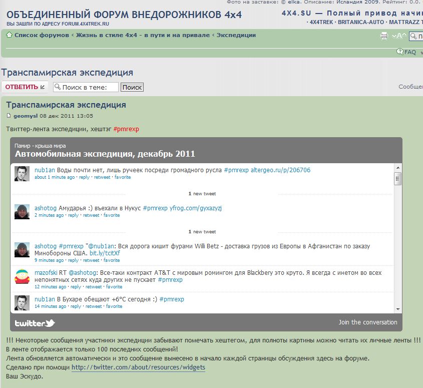 А еще в качестве эксперимента внизу всхе страниц форума появилась наша собственная лента по #4x4trek - попробуйте, все, что будет написано в твиттере по этому хештегу, автоматически появится почти сразу в этой ленте на форуме.