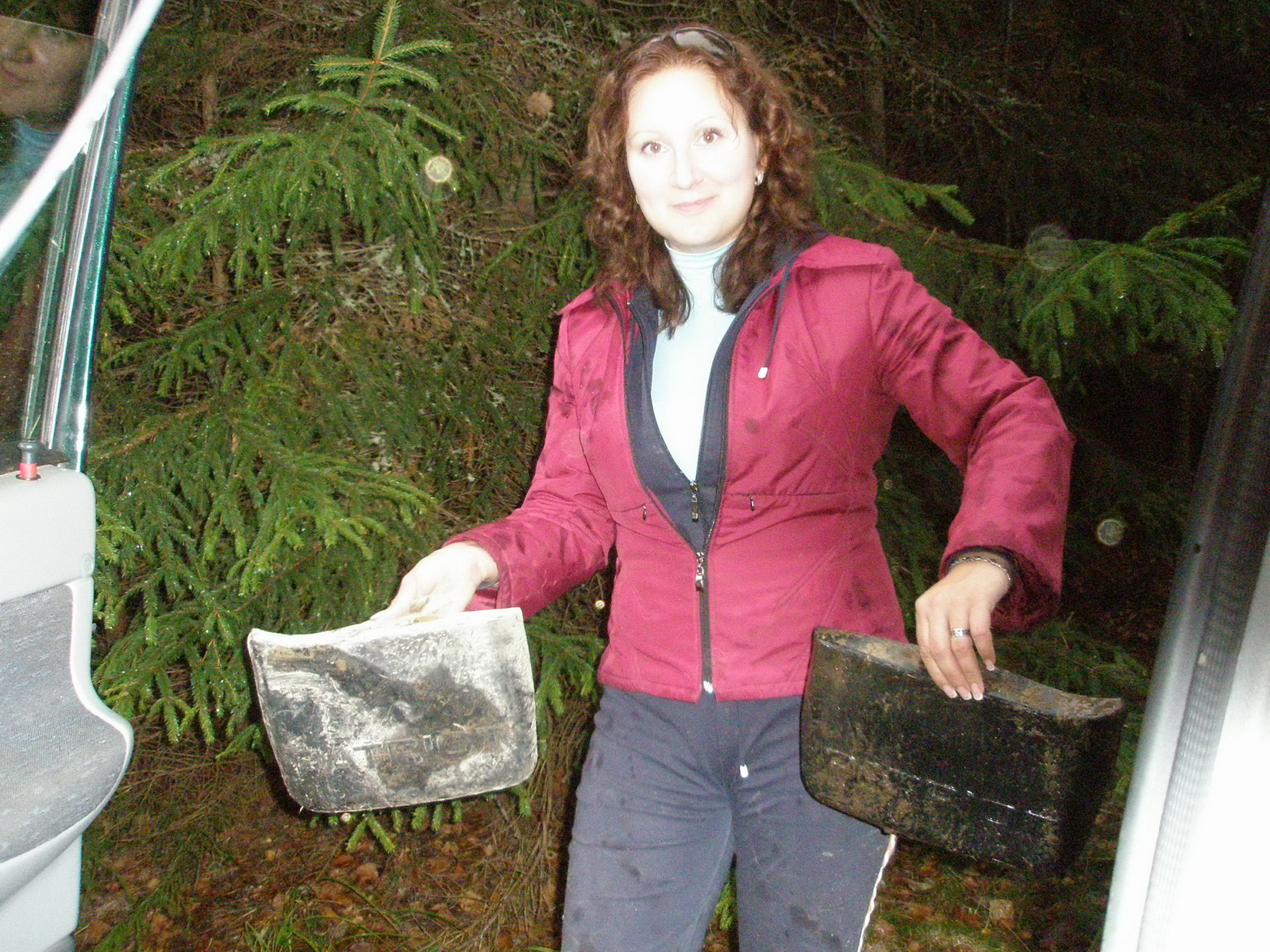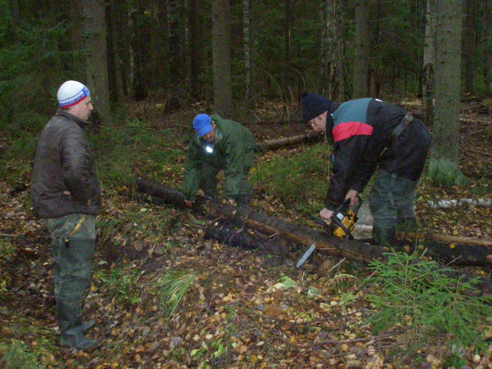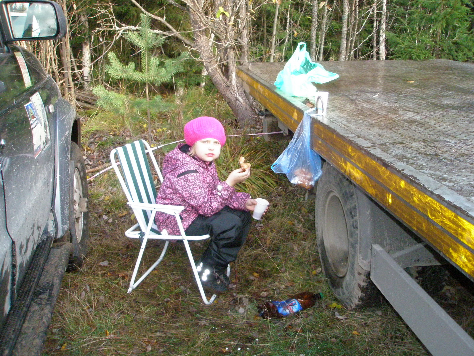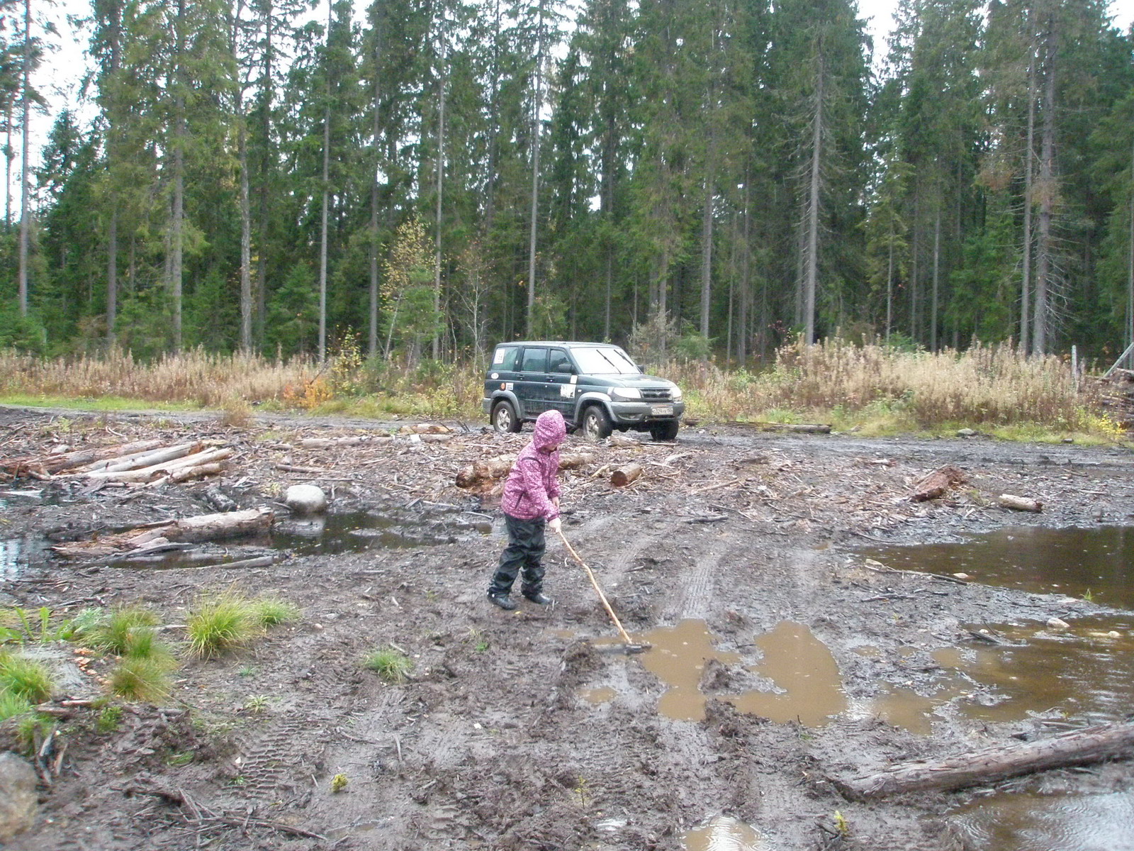 Разчудесные дорожки приводили нас, то преодолевать болотину, размешанную зубастыми колёсами других участников, а то и пробираться сквозь пеньки и валежник к точкам спецучастков… Пилот справлялся с манёврами меж пеньков просто на 5 с +!!! Я и младший штурман старались во все глаза разглядеть наличие препятствий на пути Патриота. Не всегда, правда, удавалось выбрать правильную траекторию…Вот так на одном из участков, практически, с разбега машина застряла напрочь! Спасателями оказались: лопата, бензопила и наши шесть рук :wave: Уж, очень не хотелось спать в болоте, а потому просто обязаны были вылезти! И вылезли!