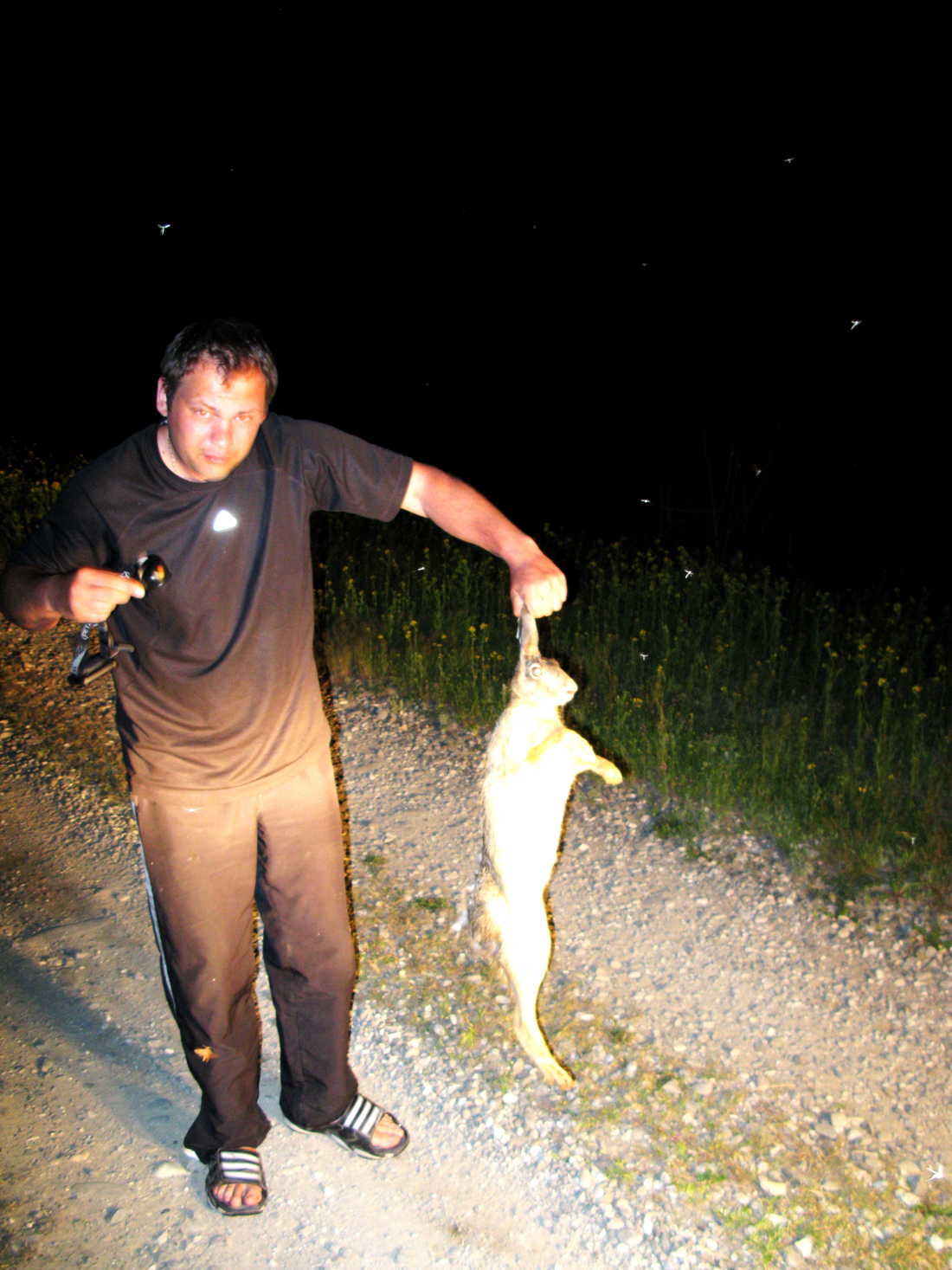 С зайцем история тёмная. Я так и не понял кто его обездвижил. Мы его нашли на дорожке с оторванным хвостом и перебитыми задними ногами. Мы так рассудили, что хищник навряд ли бы бросил такую удачную добычу и скорее всего его каким-то образом "зацепил" Интерлан. В общем заяц все равно помер своей смертью. Есть мы его не стали.