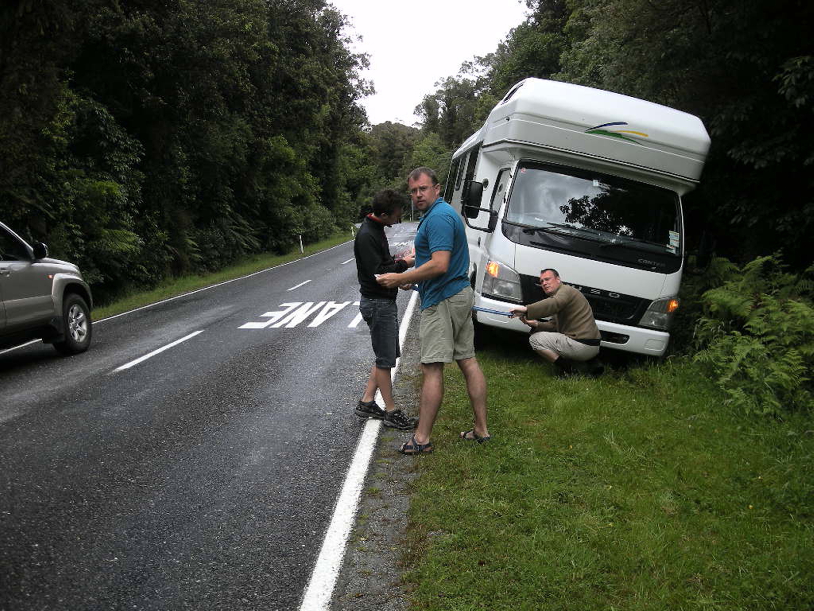 Как говорит мой приятель "картина маслом" утром 7 января,обломавшись с подьемом на ледник,мы выехали в Куинстан, так как пару дней шли дожди,все обочины дорог размыло,вот и кемпер немцев,фатер,мутер и сын за рулем,остановились ,а вот выехать,найн,нихт....капут как говорят в баварии...Проезжая мимо,вижу картину,мутер стоит скромно голосует,а немцам помогает на таком же кемпере французы,забавные люди эти лягушатники.пробовали тянуть,веревоЧкой,по типу у нас белье дамы в бигудях развешивают на такой,естественно нормального троса у них небыло. Но самое странное ,что из проезжаюших местных жителей,в том числе пара была на пикапах,все строили козьи морды и в отказ,мне же хотелось приключений, с утра я был великодушин,..отпустив с миром французкий кемпер ,я обьяснил камраду,мол надо ехать в деревню,просить трос,так как вид у них был примерно как у их предков под Москвой в 42г,пришлось улыбаясь обьяснить мол в России,народ добрыйи жалосливый,или нет? , взяв старшего,мы отправились в автосервис в паре км от места трагедии, так деревянный сарай для трех машини . но !что вы думаете господа и дамы? эти любезные киви нам отказали !,трос я видел,мог взять и так, вернул бы,я очень сейчас положительный,работаю над кармой, но воспитанный и вежливый потерпевший просил трос на пол часа в аренду,нам о т к а з а л и ! я в шоке,немец чуть не плачет,у меня в машине из инструментов,домкрат и фотоаппарат,как вы понимаете,это немного не то.Я уже злюсь,так тихэенько тихэенько завожусь как мопед верховина 2,и думаю как же мне слямзить трос и помочь моей любимой нации,несмотря на то что мой дед их в Кенгсберге лупил как котят,ну да ладно говорю,черрррт с ними этими жлобами,поехали купим трос , рядом была бензоколонка ,говорил эмоционально,поняли все,(матом не ругался,факушек не показывал,слюной не брызгал) хотя пассивность немца уже злила не на шутку,и как они такие фильмы снимают?купив трос,чудо тайваня,вернулись,где за час,никто не остановился помочь!,мутер она же фройлян тихо плакала в кемпере,сын газовал,видимо надеясь удивить нас по приезду,идиот,кемпер он не просто тяжелый сарай с туалетом но и очень высокий ,машина стоит под углом,вообщем цирк. Спасли! слезы,благодарные слова,салют ифлаги,как на Эльбе...эх хорошо провел время...