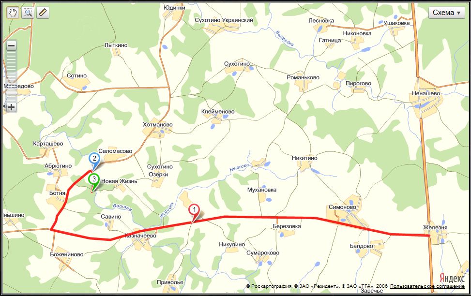 Доезд до лагеря: далее от места встречи по Р-143 до поворота на Ботню, там направо и до моста через реку Вашана (точка 2), перед мостом направо в поля и вдоль реки (дорога проезжая для жигулей) к лагерю (точка 3). От места встречи примерно 10 км.