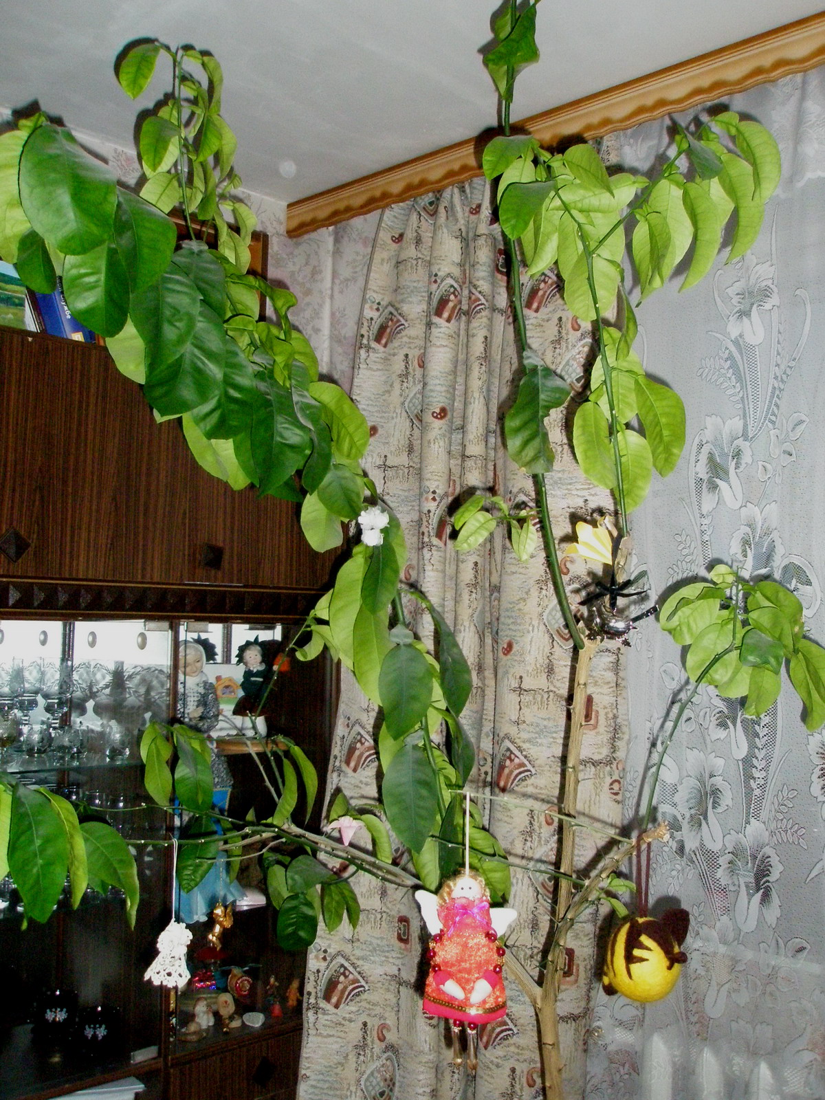 Моей ёлкой в этом году стало мандариновое дерево. Оно тоже вечно зеленое и даже иголки есть. Игрушки собираю оригинальные и, в основном, ручной работы. Жаль только, что эта ёлка на прошлой неделе скинула часть листьев...чуток я перестаралась с проветриванием комнаты...