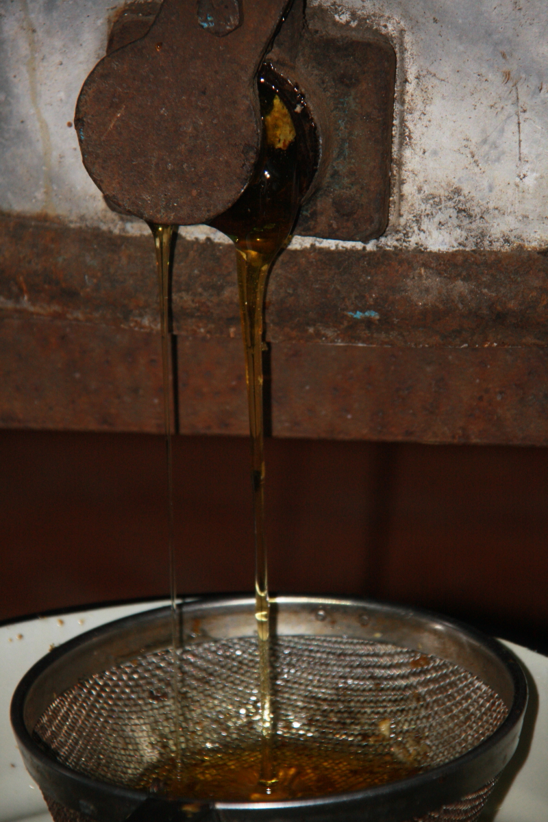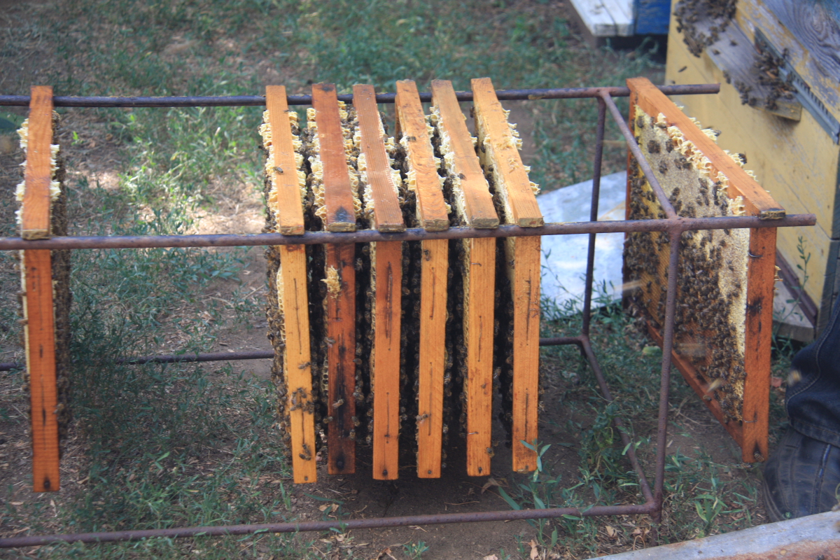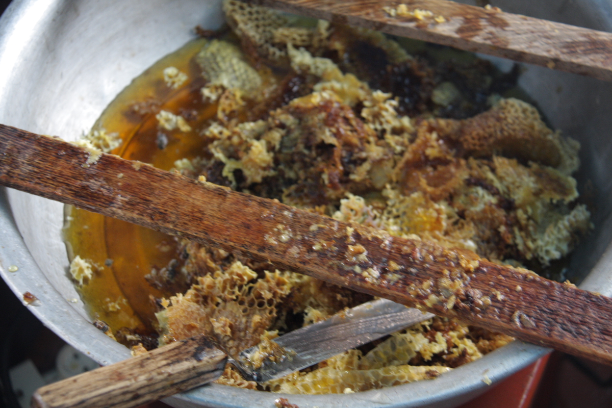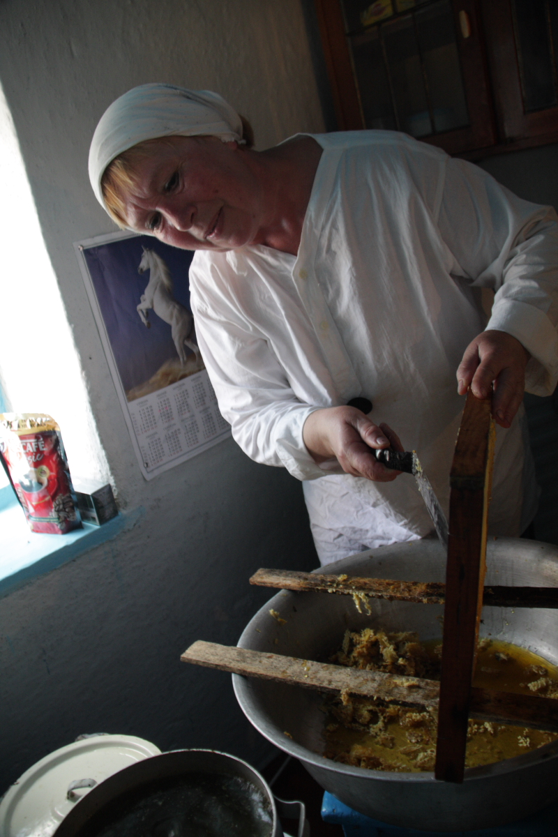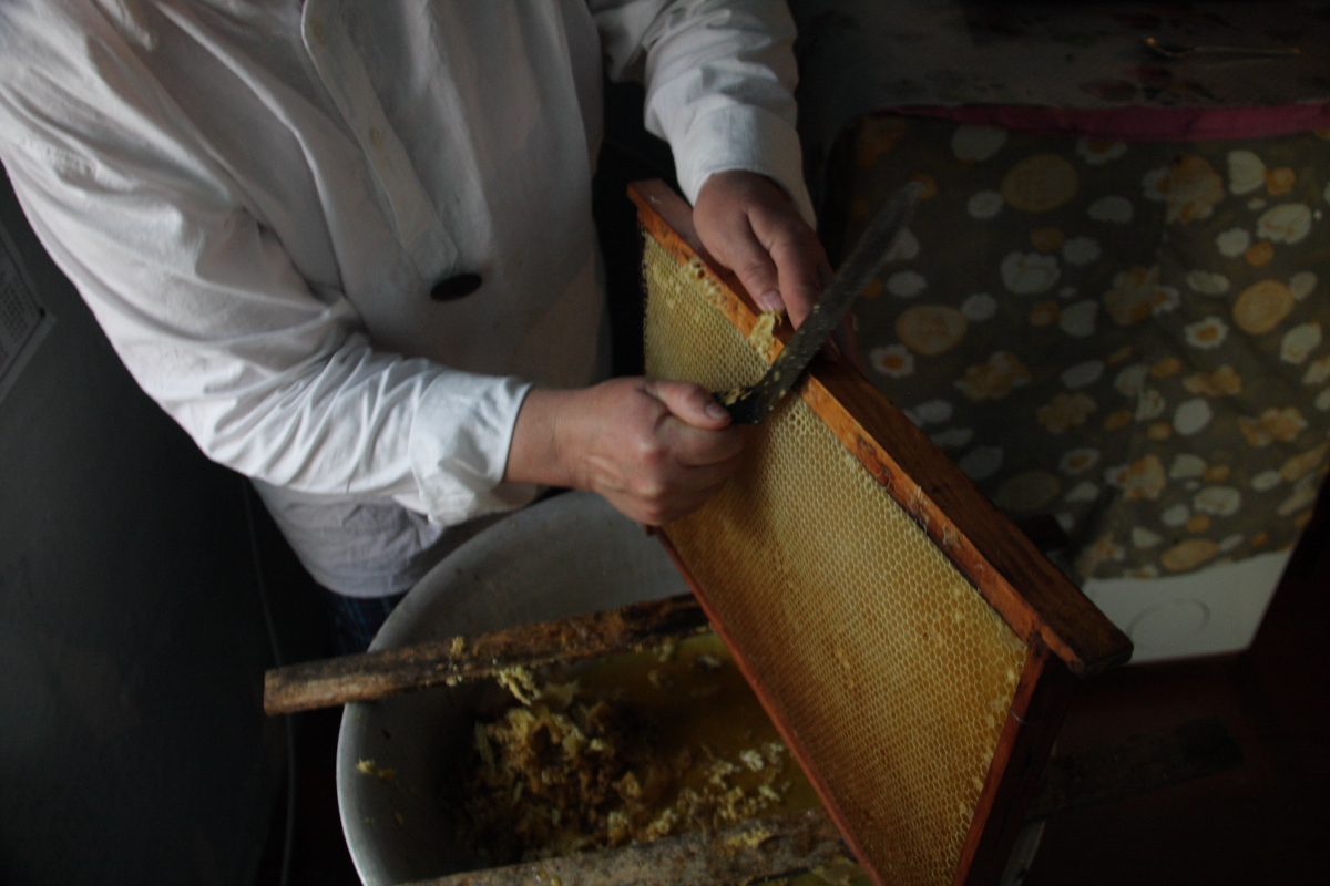 Довольно трудно и нужна сноровка срезать соты ножом, постоянно смачивая его горячей водой и следя за сотами ,там могут быть личинки пчел…часть меда нужно оставить для пчелиной семьи…