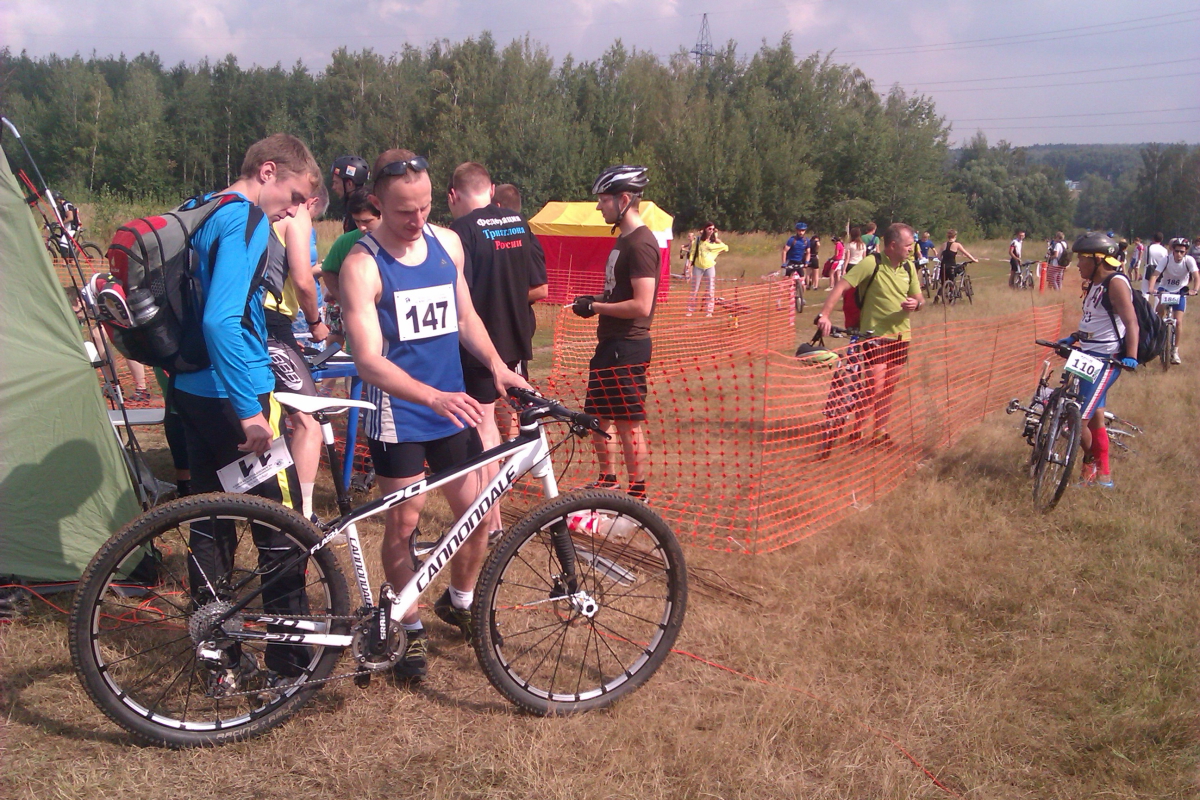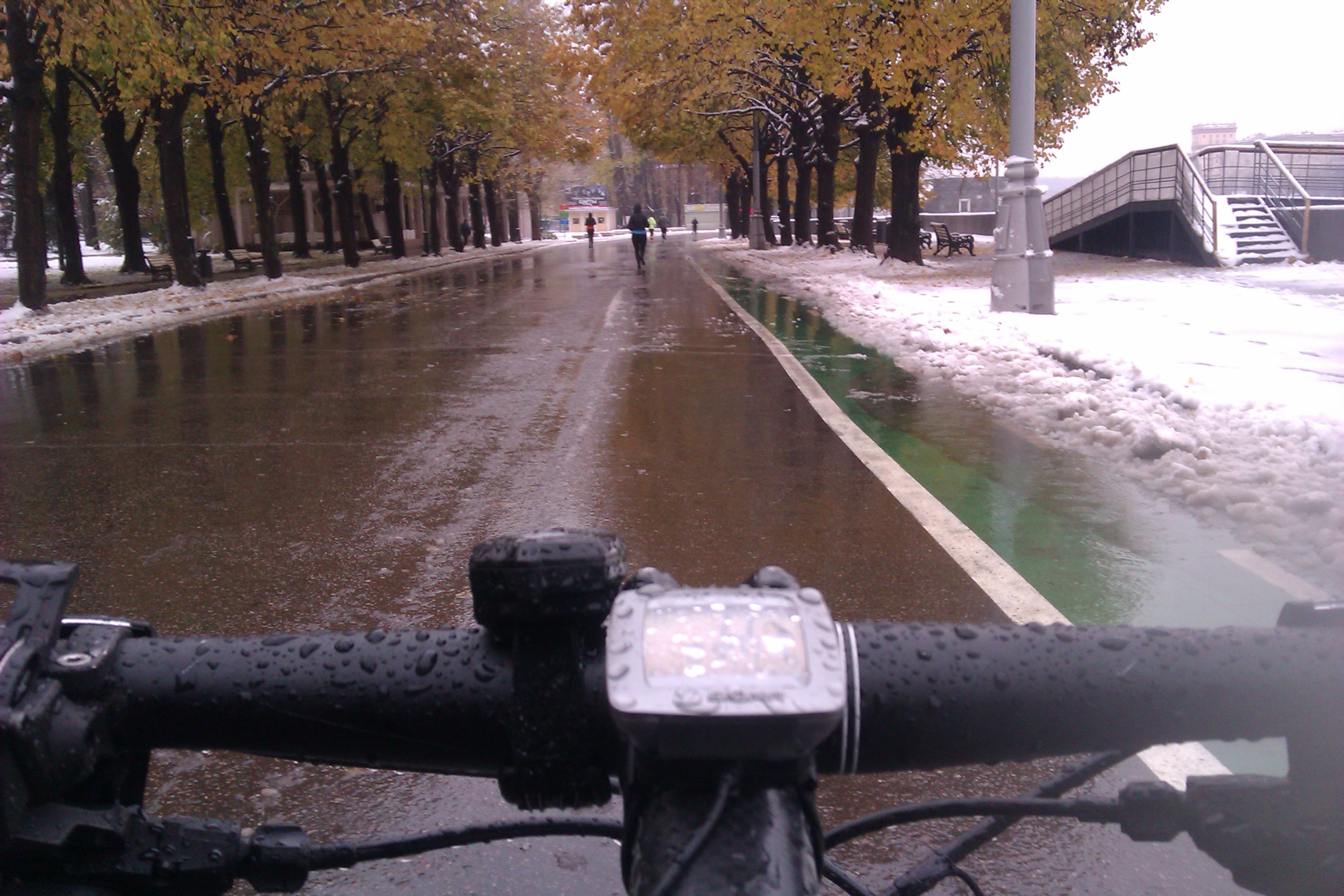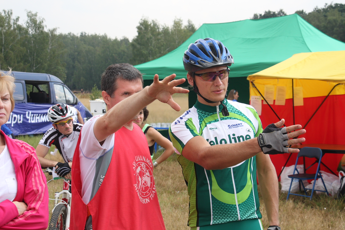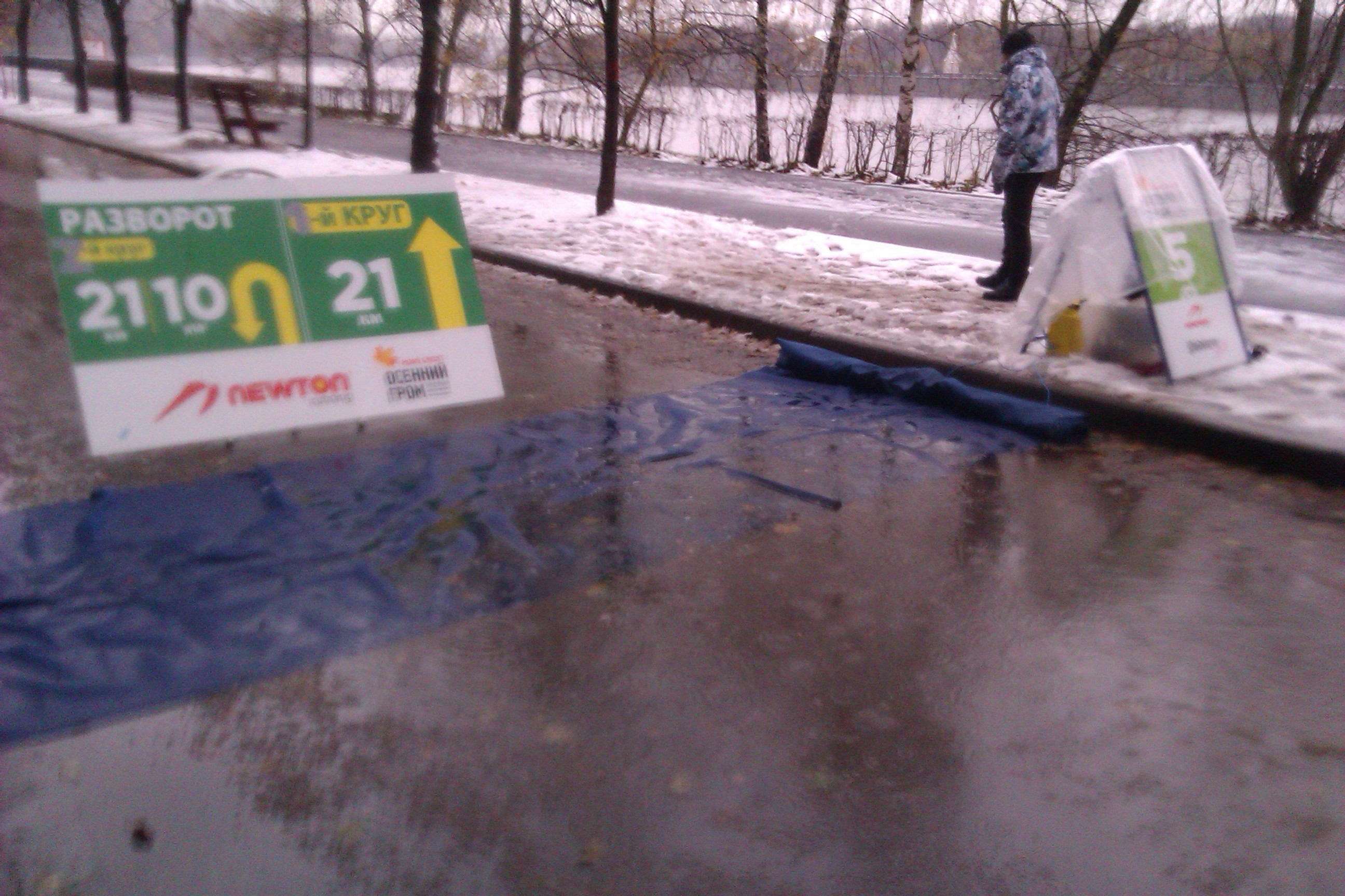 Так как в парке ,даже в такую дождливую погоду гуляли люди и трассу нам не позволили перекрыть, пришлось ехать на велике , сначала за последним( дед бежал,да так бежал все 21 км! )