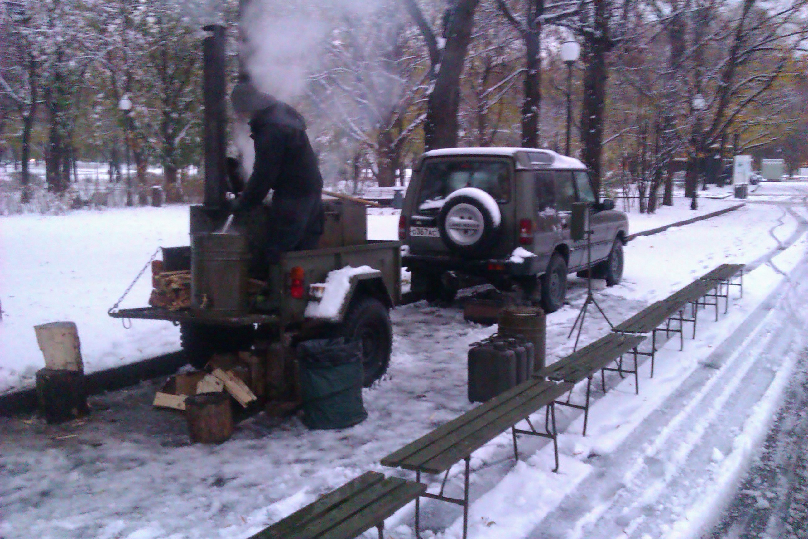 Была арендована полевая кухня,на прицепе ( к Ландроверу!)