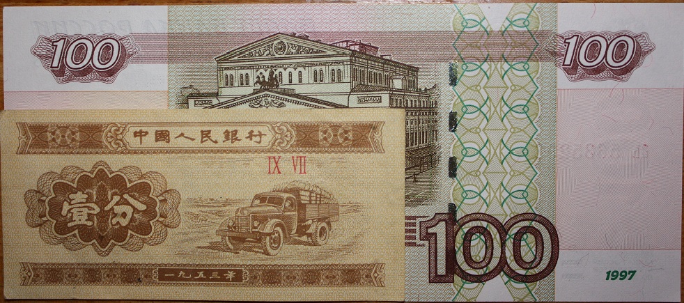У меня есть вот такая уникальная деньга. Успел застать ее еще в ходу. Это бумажная фэня = китайская копейка. Сейчас очень, очень жалею, что оставил себе только одну: в обменниках китайских банков всегда давали под полный расчет, включая ворох этой мелочевки, на которую ничего нельзя было купить и от которой отказывались даже чемоданоносцы в гостиницах. Но я, дурак, оставил только одну...