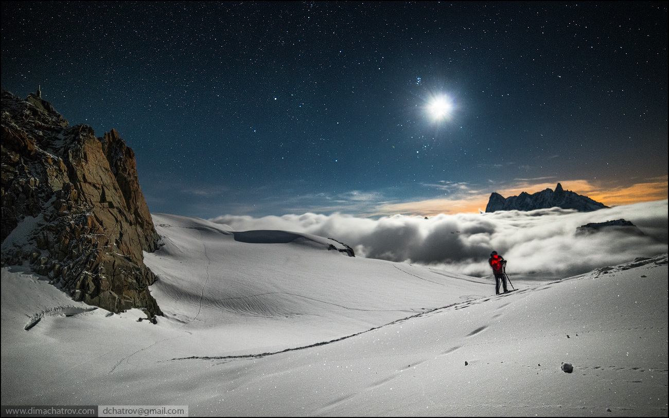 Франция, склон Монблана. Морозное полнолуние в белой долине. Где-то там, всего парой километров ниже, разлилась густая августовская ночь, надрываются цикады и льется рекой вино в кафе-шантанах. Гуляют романтические парочки, сладко плывет голова и гулко стучит сердце, предвкушая… Но фотографы и альпинисты - странные существа. Им нужно обязательно забраться как можно выше, выползти в кошках или со штативом на ледник, чтобы морозить бочка под ледяной луной. А потом на пару часов затаиться в спальнике в ожидании рассвета, и снова на ледник…