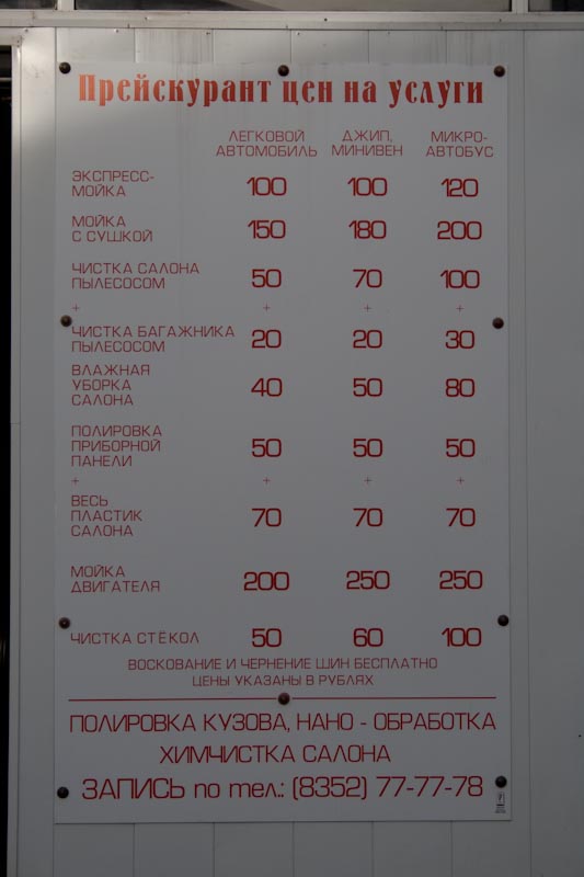 А мойка в Чебоксарах, вы не поверите. За пробивку колёсных арок, днища, мойку ковриков, мойку кузова с пеной, но без сушки с меня взяли... 100 рублей. Я аж прайс у них сфотграфировал.