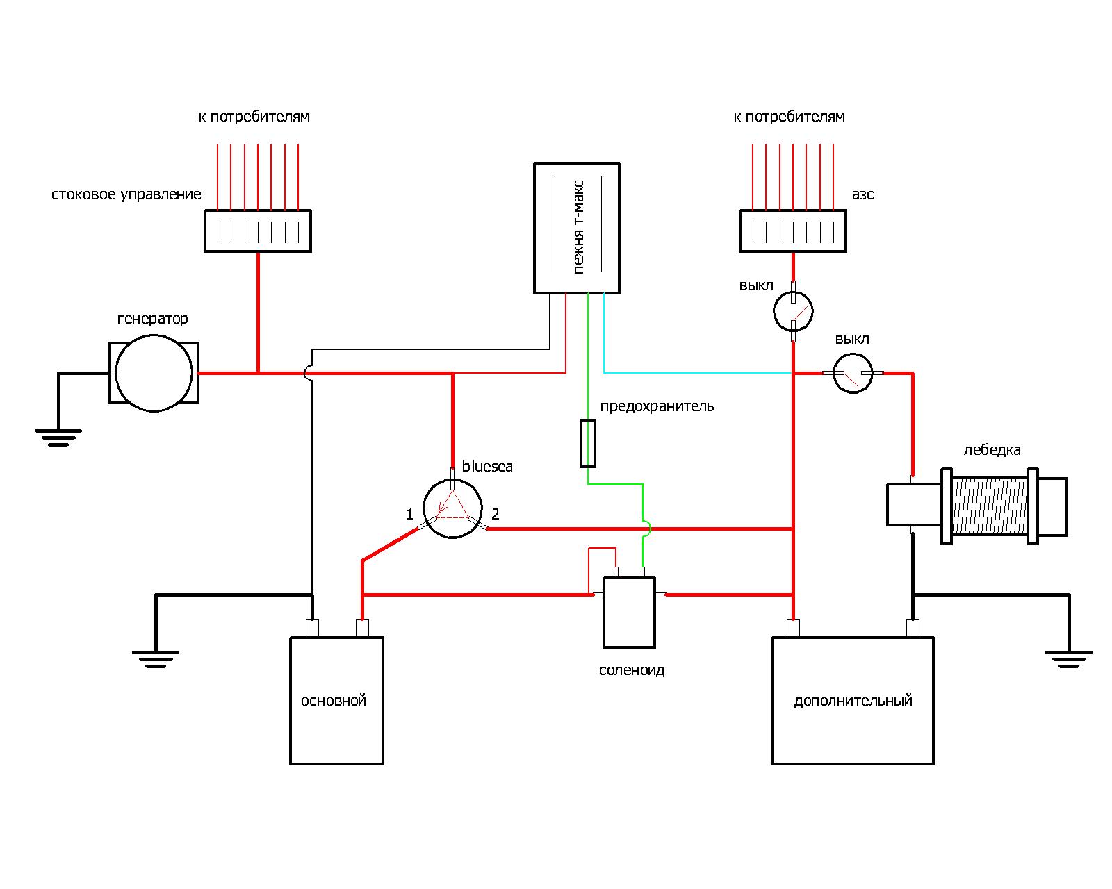 Пользуюсь данной штукой (T-Max). Лебедка висит на основном аккумуляторе, на дополнительном висит всё, что не является жизненно необходимым, т.е. доп.свет, компрессоры, холодильник, инвертор, рация ...