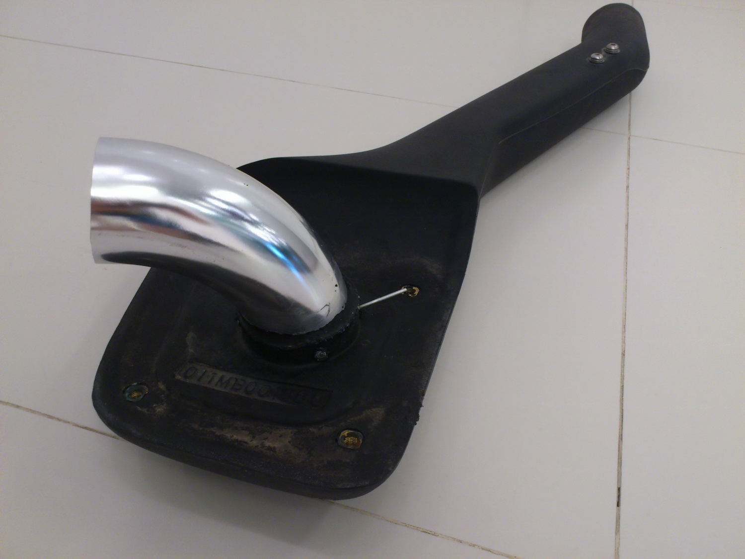Выходная дырка шноркеля имеет внутренний диаметр 70мм. Корпус воздушного фильтра устроен следующим образом. Видимая часть, в которую входит воздушный патрубок, имеет наружный диаметр 100 мм. Внутри стоит пластиковая деталь, напоминающая вентилятор (см. фото4). Она загоняет поток в другую трубу (снаружи ее не видно), которая имеет длину 35мм и наружный диаметр 70 мм. Через нее воздух входит в фильтр. Зазор между 100мм трубой и 70мм трубой недостаточен для размещения там хомута.