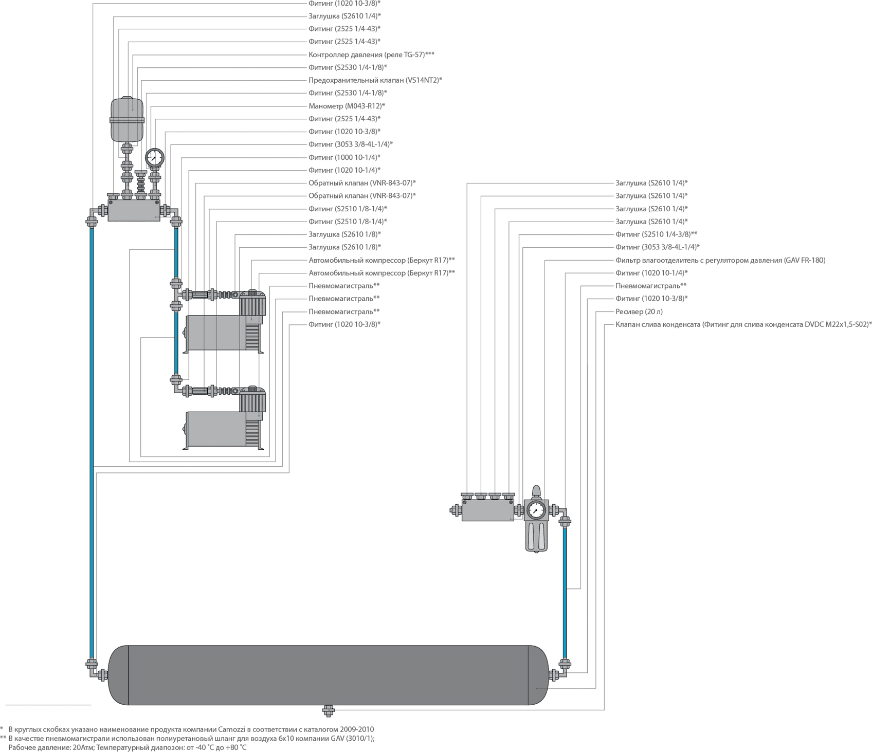 На схеме снизу подписано рабочее давление шлангов 20 атм при температуре -40+80