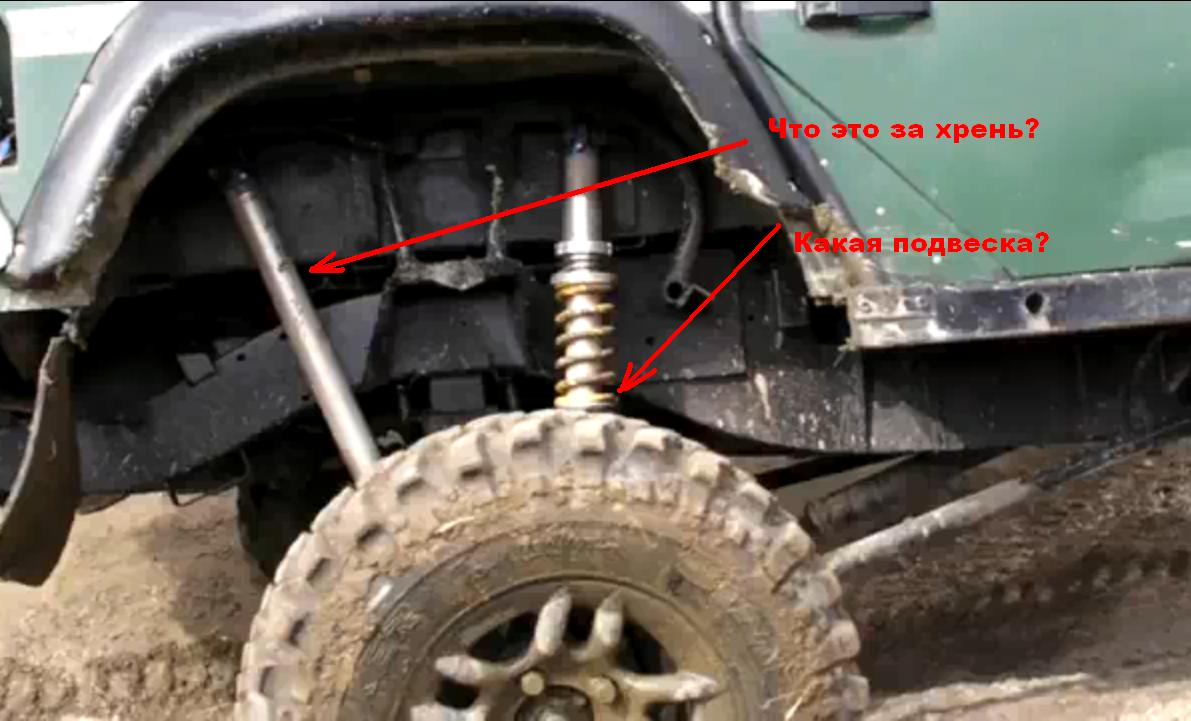 спереди: подвеска на трёх рычагах, кардан на гуке, два длинноходных амортизатора (капот даже переделан) - один сделан стойкой с пружинами разной жесткости.