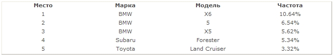 По итогам первого полугодия 2010 года абсолютным лидером угоняемости среди застрахованных РОСНО автомобилей и в Москве, и в Санкт-Петербурге стал автомобиль BMW X6 / БМВ X6.