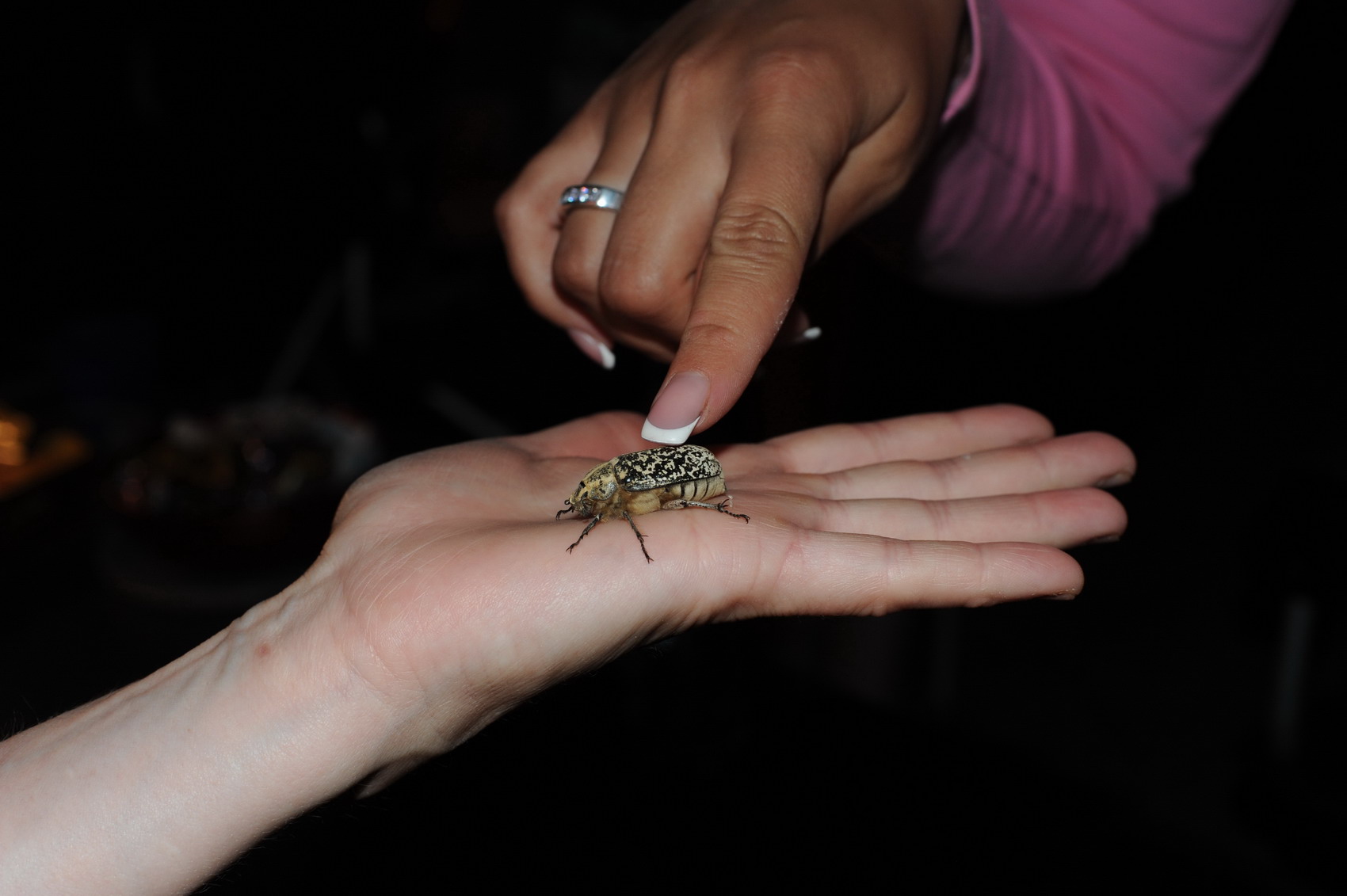 У вечернего костра на брифинге на мою кофту приземлился большой жук! О различных насекомых, обитающих на данной местности, мы были наслышаны. Но этот жук оказался никому не знаком. Его затейливый окрас крыльев имел своеобразный рисунок, а звуки, которые издавало насекомое, от прикосновения, напоминало повизгивание поросенка…