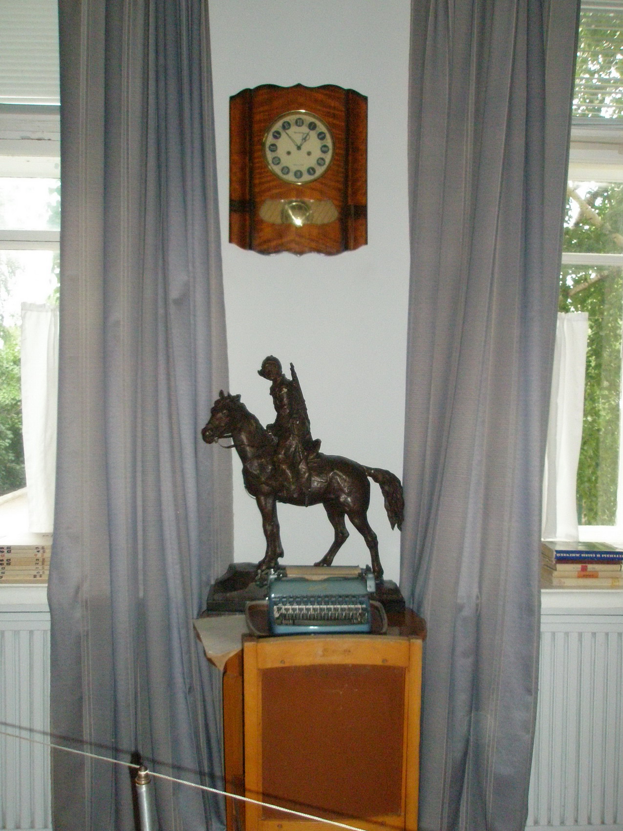 Миновав набережную, сфотографировавшись у памятника Юрию Гагарину, вышли на одну из красивых центральных улиц Вёшенской. Многие дома сохранились, почти, в первозданном виде…Попадались деревянные дымоходы, а глядя на некоторые из них, можно было заметить творческих подход в оформлении. Редко, но встречались крыши, крытые тростником. Говорят, что тростник не пропускает воду и сохраняет свои свойства до 20 лет при должном уходе. Сильно выделяется на таком фоне усадьба Шолохова. Двухэтажное светлое здание с деревянными колоннами утопает в зелени. Тишина…Количества комнат не запомнила, но их много и в каждом (за исключением спален) стоит письменный стол…так показалось…Два этажа, старая мебель и лошади…кругом лошади…в виде статуэток, чеканки…Шолохов любил лошадей. В одной из комнат камин. Запомнилось – домашние называли его «крематорий», потому что писатель сжигал в нём рукописи. Не менее интересной была экскурсия в гараж. Там всего 4 машины, но они такие разные…все на ходу. Впечатлил замок в двери гаража, но больше всего порадовал ключик от этого замка. Ключик размером с «золотой», как у Буратино.